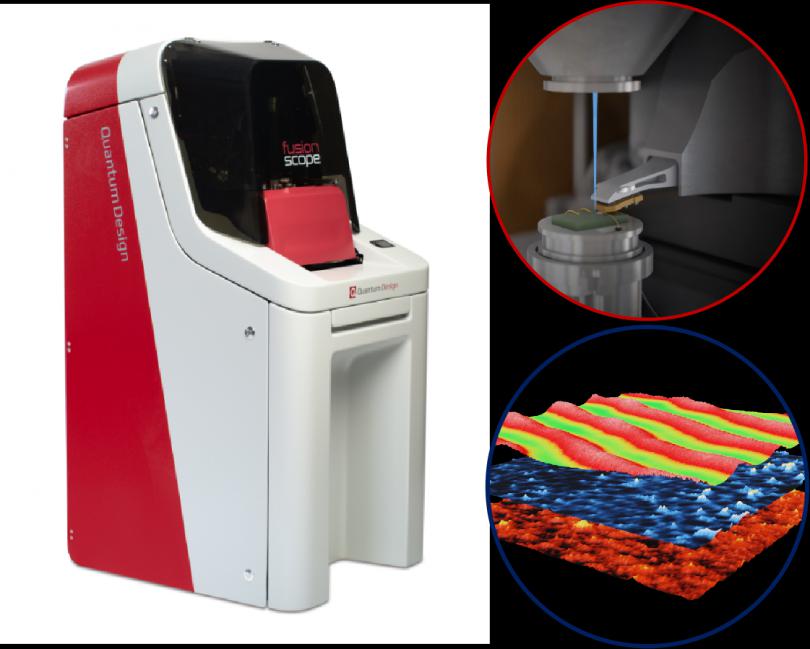 針對(duì)上述難點(diǎn),Quantum Design公司研發(fā)推出了聯(lián)合共坐標(biāo)AFM/SEM二合***顯微鏡-FusionScope。在FusionScope中,SEM和AFM通過其內(nèi)置的共坐標(biāo)系統(tǒng)進(jìn)行結(jié)合。在使用過程中,只需要在SEM成像結(jié)果中點(diǎn)擊相關(guān)位置,F(xiàn)usionScope就可以自動(dòng)引導(dǎo)AFM探針到相關(guān)位置,然后進(jìn)行AFM表征。為了滿足不同的研究需要,F(xiàn)usionScope不僅可對(duì)微結(jié)構(gòu)的三維結(jié)構(gòu)進(jìn)行成像,還可以對(duì)區(qū)域的電學(xué)、磁學(xué)和力學(xué)等性能進(jìn)行表征。隨著FusionScope設(shè)備的推出,已有多個(gè)課題組利用FusionScope在***些高水平的***際期刊發(fā)表了相關(guān)的研究成果。