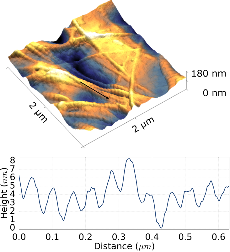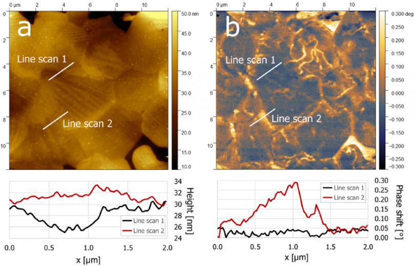 在3V的電壓下FusionScope的a)原子自理顯微鏡(Atomic Force Microscopy, AFM)對(duì)樣品形貌的成像效果和b) 靜電力顯微鏡(Electrostatic Force Microscopy, EFM)下相同電壓且同***區(qū)域的成像結(jié)果