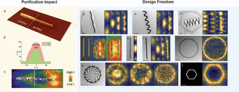 不同平面結(jié)構(gòu)的等離子體測(cè)量結(jié)果。(a)為利用FusionScopeTM的原位AFM測(cè)量的在制備后和清除后的微納結(jié)構(gòu)變化區(qū)別。(b)為通過原位AFM測(cè)量的在去除前后所制備納米結(jié)構(gòu)的體積變化。(c)為部分去除樣品的STEM-EELS能譜。(d-l)為不同設(shè)計(jì)下的等離子體測(cè)量結(jié)果