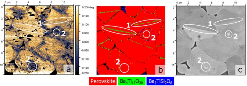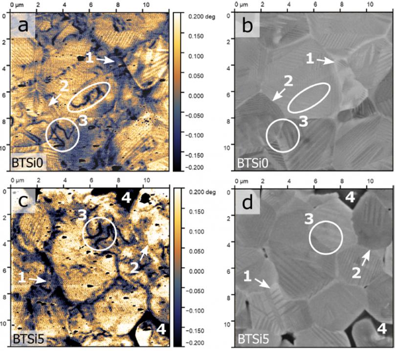 通過FusionScope獲得的(a)SiO2含量為0%和(c)SiO2含量為5%的BaTiO3陶瓷樣品的EFM結(jié)果。(b)和(d)為(a)和(c)同***微區(qū)的背散射電子成像結(jié)果