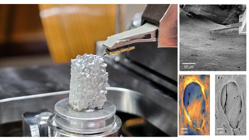 人工骨骼樣品放置在FusionScope的樣品臺(tái)上。右方為FusionScope對(duì)人工骨骼的特定區(qū)域進(jìn)行三維表征