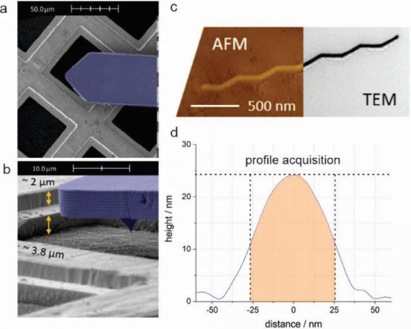 利用FusionScopeTM獲取用于模擬的數(shù)據(jù)。(a-b)在FusionScopeTM中利用SEM對(duì)AFM進(jìn)行引導(dǎo),在放置在TEM網(wǎng)格上的Au納米線進(jìn)行測(cè)量。(c)對(duì)FusionScopeTM所獲得的數(shù)據(jù)和TEM所獲得的數(shù)據(jù)進(jìn)行相互驗(yàn)證。(d)FusionScopeTM測(cè)量Au納米線的高度為24 nm,半峰寬為51 nm