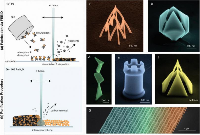制備、清除和3D加工能力展示。(a)氣體注入系統(tǒng)(GIS)將金屬氣體前驅(qū)物分子(Me2(acac)Au(III))注入到基底附近,利用聚焦電子束形成在基底上形成沉積。(b-g)展示了FEBID制備復(fù)雜構(gòu)型的3D納米結(jié)構(gòu)的能力。(h)為運(yùn)用聚焦電子束去除碳的過程