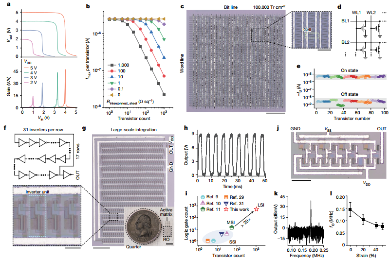 圖4. 由晶體管所構成的集成電路。a) 輸出增益電壓的改變;b) 驅動電流的模擬結果;c)高密度集成電路的光學照片;d)電路構成示意圖;e)高密度電路的測量結果;f)和g)大規模集成電路的示意圖;h) 527***環形振蕩器的輸出波形; i)本工作和報道工作的對比;j)三***慣性振蕩器的照片;k)10個振蕩器中,輸出快的頻率圖譜;l)不同應變條件下的震蕩頻率。