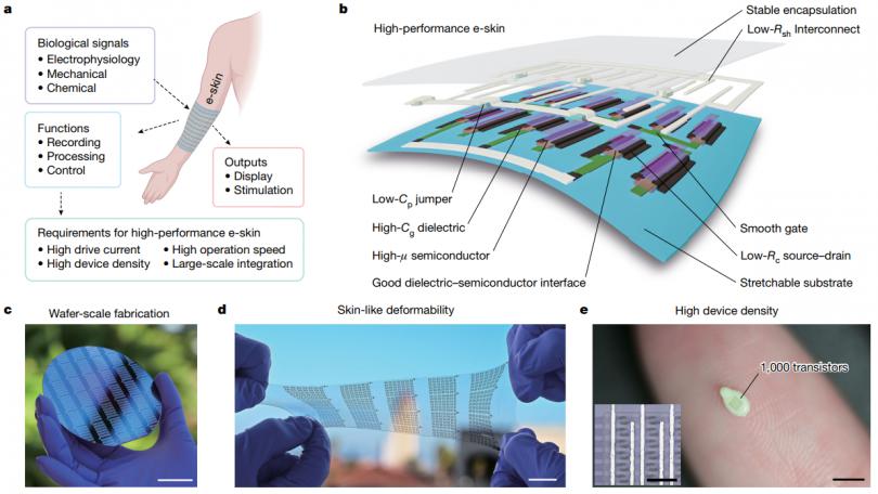 圖1.本征可拉伸,高性能類皮膚電子器件。a)本征可拉伸的傳感器的核心地位以及高性能要求的示意圖;b)高性能本征可拉伸電子器件的三維示意圖; c)在4寸硅片上制備高性能器件;d)在大尺寸柔性基底上制備可拉伸的電子器件;e)高密度傳感器(1000個晶體管)制備在***顆芝麻上。