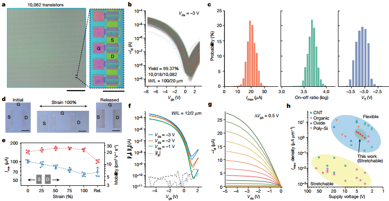 圖3. 本征可拉伸電子器件的電學和力學特性;a)所制備的電子器件的光學照片;b)10082個晶體管,良率為99.37%; c)晶體管的電學特性;d)電子器件在未拉伸,***拉伸和釋放拉伸后的情形; e)電子器件的電學性能隨著拉伸的變化;f)和g)電子管的輸出特性;h)本工作和以前工作的比較。