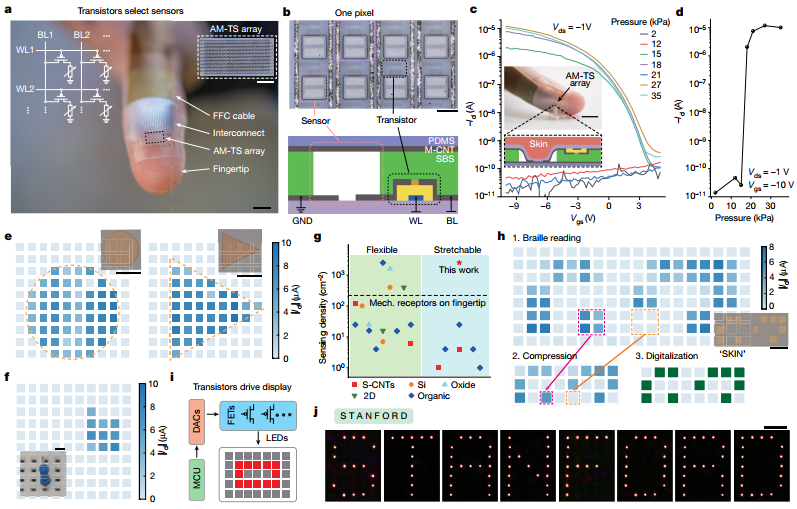 圖5.可拉伸電子器件用于觸覺感知和LED顯示。a)感知傳感陣列的設計圖和實物圖;b)傳感器的光學照片;c)不同壓力下的電流和d)電壓;e)不同形狀觸壓下的電流;f)在插入金屬棒時的表現;g)本工作和其他工作相比較的結果;h)在傳感器上按壓盲文SKIN的結果;i)LED顯示電路;j)作為LED顯示的結果。