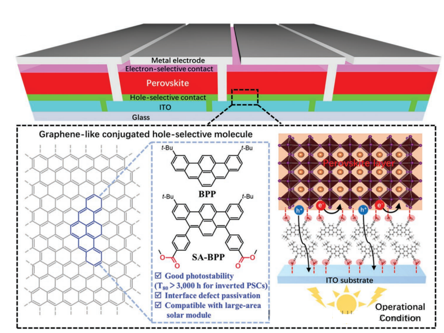鈣鈦礦吸收層與空穴傳輸層之間界面的相互作用是影響鈣鈦礦電池穩定性的關鍵因素。對此,戚亞冰教授研究團隊制備了***種類石墨烯共軛結構的自錨式苯并[rst]五酚(SA-BPP)分子,用以替代傳統的三苯胺和咔唑基的空穴選擇性分子,成功開發了新型的空穴選擇性接觸層。研究表明,使用SA-BPP制備的IPSCs具有更高的光穩定性和光電轉換效率。此外,SA-BPP分子結構中的錨定基團還可促使ITO基底上形成大規模的均勻的空穴接觸,并有效地鈍化鈣鈦礦吸光層。