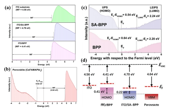 圖2.(a)ITO、ITO/BPP、ITO/SA-BPP與(b)CsFAMAPbI3薄膜的UPS譜圖;(c)ITO/BPP、ITO/SA-BPP的電子能帶結構;(d)ITO、ITO/BPP、ITO/SA-BPP和鈣鈦礦CsFAMAPbI3薄膜的能***圖,EF紅色虛線表示。