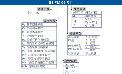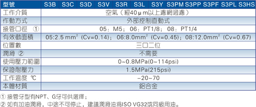 2) S3B、S3C、S3D、S3PM、S3PF、S3PP 系列為自動復(fù)位。S3Y、S3HS、S3PL手動閥為手動復(fù)位。其中S3PL押入定位后,須旋轉(zhuǎn)旋轉(zhuǎn)鈕才能復(fù)位。