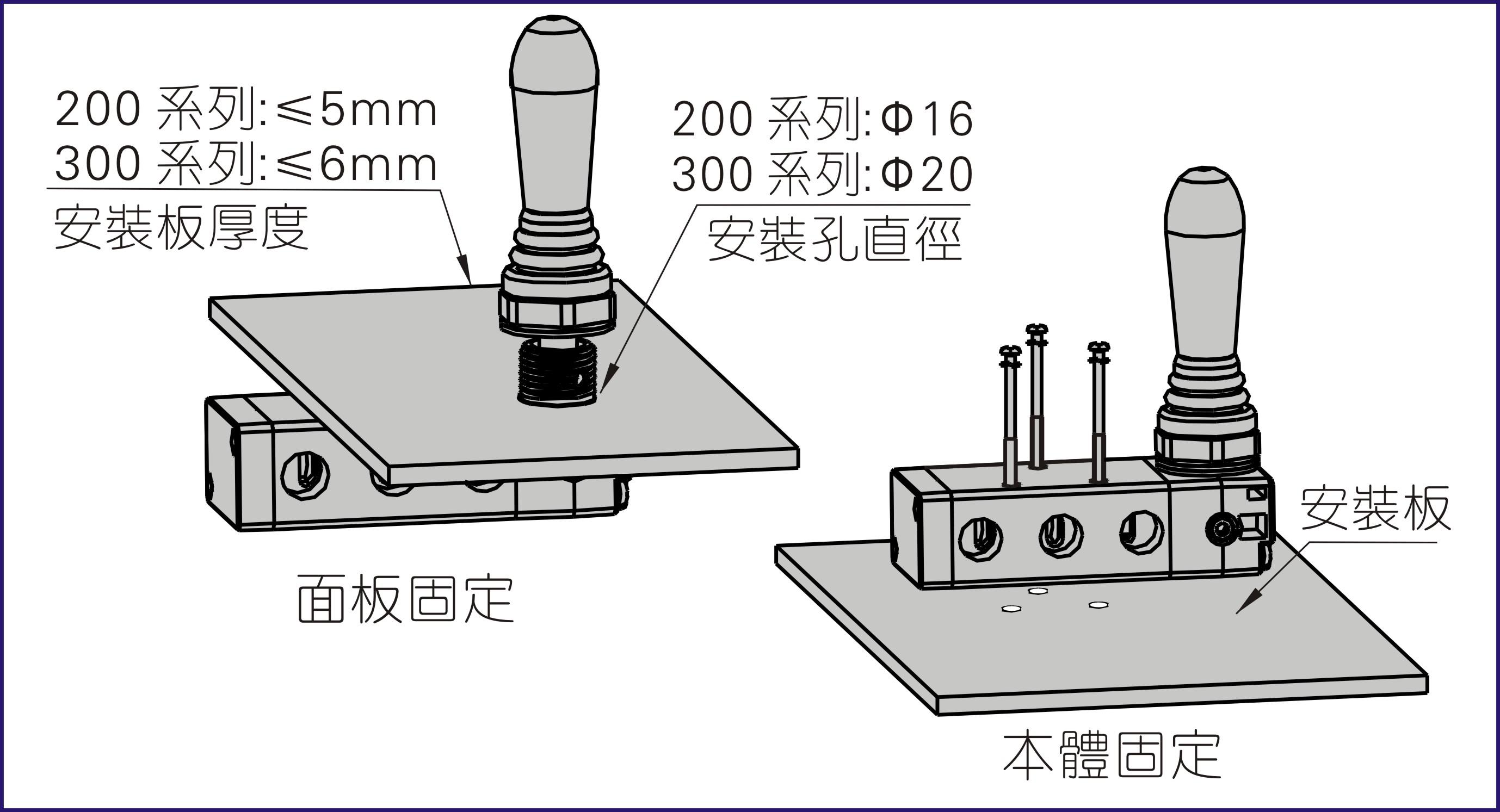 特別注意:面板固定時,安裝板的厚度及安裝孔直徑的大小。