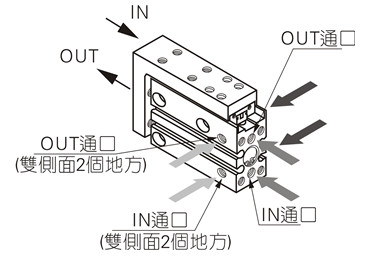 2、氣缸可從3個方向配管,默認出廠為后端面進出氣,側面兩組進出氣口已用堵頭密封,也可根據實際需要重新開啟側面其它兩組進出氣口;