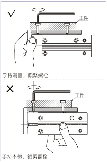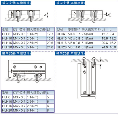 7.1、可從以下二面將工件固定在氣缸滑臺上,固定鎖緊螺栓時,請在限制范圍內的力矩值,選用合適的力矩來鎖緊。在滑臺上面固定工件時,螺栓長度(圖中L值)不可超過內牙深度,否則螺栓前端與線性導軌接觸而導致損壞線性導軌;