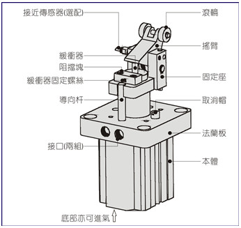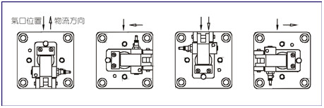 當法蘭固定時,如需調整阻擋方向,可調整導向桿的安裝位置即可改變阻擋氣缸的工作方向。