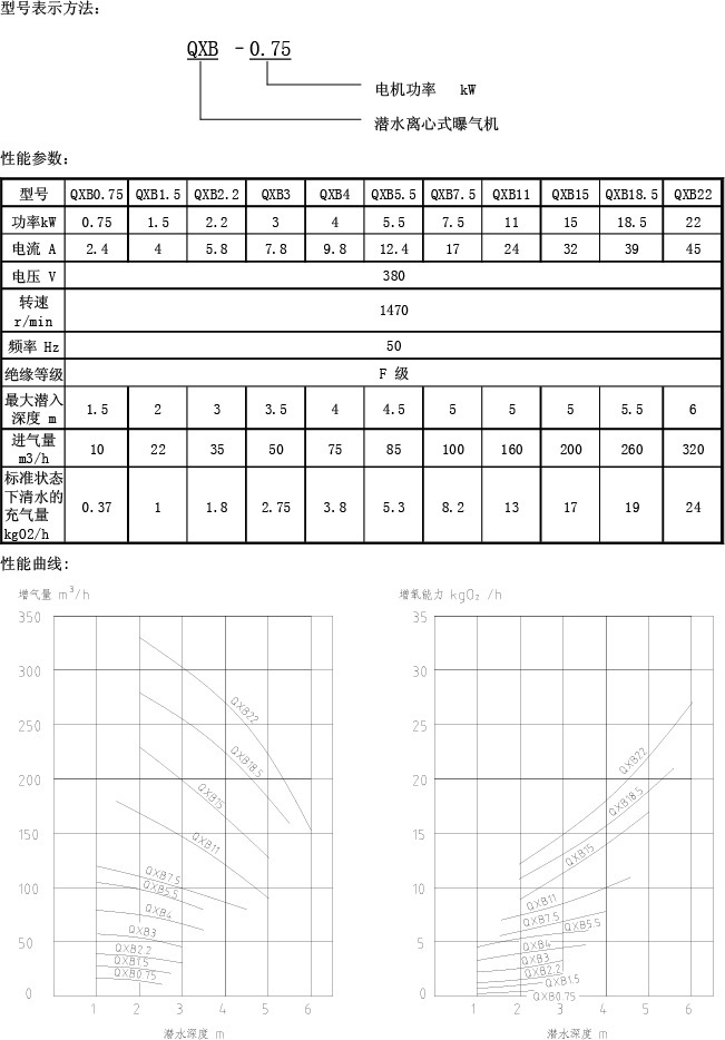 QXB 型離心式潛水曝氣機為直聯式結構。旋轉的葉輪在水中產生 個離心力,通過離心力在葉輪周圍形成 個負壓區,空氣通過進氣管被吸入,被吸入的空氣和水在混合盤內混合,隨后這種良好的均勻的混合物自動從排出口排出。