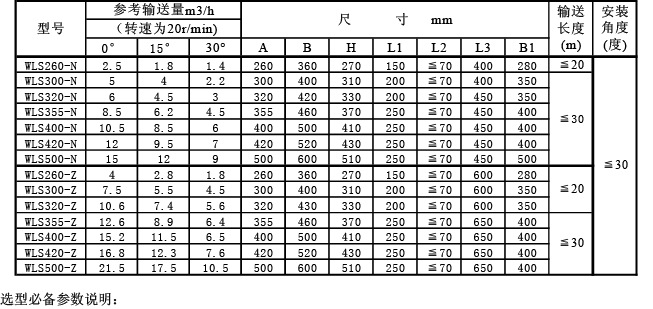 必備:螺旋直徑A、輸送長度L、螺旋材質、U型槽材質無說明的按標配:安裝角度0°,進料口高度0.6M,功率標配,減速機標配無軸螺旋輸送機主機外型尺寸: