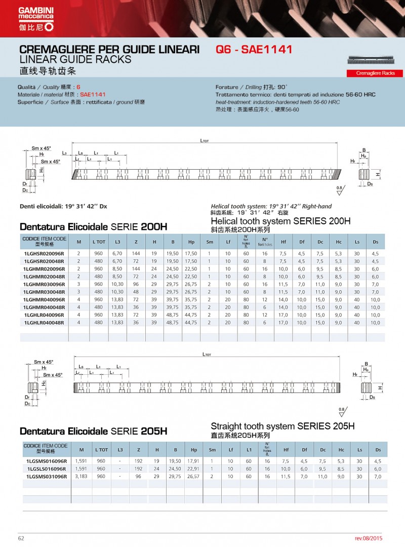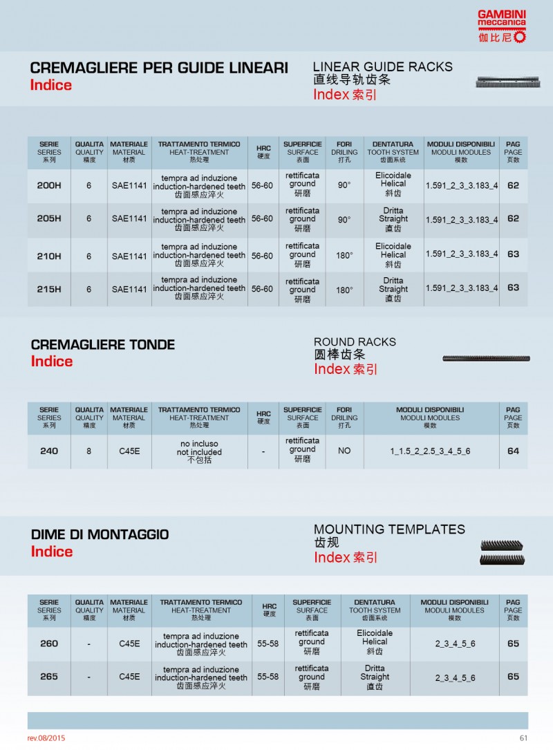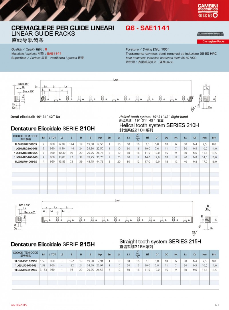 Gambini可使用不同類型的原材料生產高精度的直齒條和斜齒條。我們生產的齒輪齒條模數范圍為M0.5到M42,品質等 范圍Q5到Q10。品質等 Q5的齒條長度為1000mm,如果品質等 為Q6,可生產的單件長度可達2000mm。Gambini高精度的齒條和齒輪廣泛應用激光切割;CNC機床、三坐標測量儀、 七軸機器人等.產品有多種不同類型的熱處理方法。市面上***常使用和要求加工的是感應淬火齒條和表面硬化和感應淬火的齒輪。當然,我們也生產不需要熱處理的產品(所有我們的型號)。通過特殊研究,我們也可生產保護工件(防腐蝕和防磨損)的不同類型的表面處理;也可進行特殊上色和表面彩色處理。