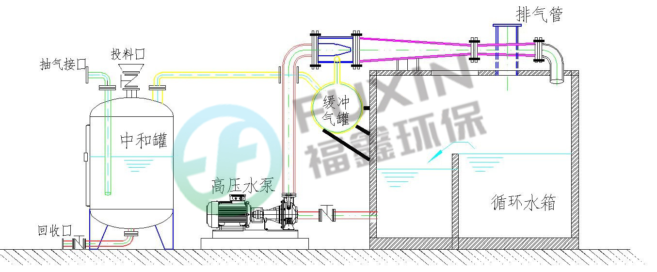 福鑫環(huán)保真空泵機(jī)組又稱(chēng)射流泵和噴射器。利用高壓工作流體的噴射作用來(lái)對(duì)廢氣處理。整套機(jī)組由噴嘴、混合室、擴(kuò)大管、緩沖氣罐、高壓水泵及循環(huán)水箱等構(gòu)成。工作流體在高壓水泵的作用下,經(jīng)過(guò)噴嘴以高速度射出時(shí),混合室內(nèi)產(chǎn)生低壓,被處理的廢氣被吸入混合室,與工作流體產(chǎn)生相混,并激烈碰撞混合,對(duì)廢氣進(jìn)行中和,隨后 同進(jìn)入擴(kuò)大管。在經(jīng)過(guò)擴(kuò)大管時(shí),流體的壓力又逐漸下降,然后排出至循環(huán)水箱。