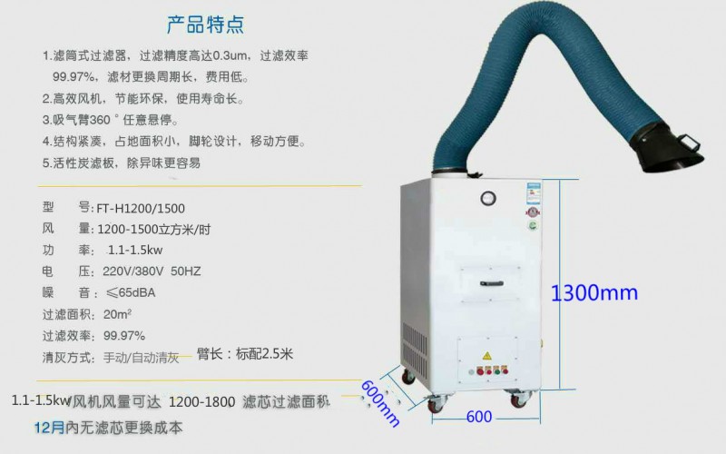 主要部件包括:萬向吸塵臂、耐高溫吸塵軟管、吸塵罩(帶風(fēng)量調(diào)節(jié)閥)、阻火網(wǎng)、阻燃高效濾芯、脈沖反吹裝置、脈沖電磁閥、壓差表、潔凈室、活性碳過濾器、沉灰抽屜組合、阻燃吸音棉、帶剎車的新韓式腳輪、風(fēng)機、ABB電機以及電控箱等。
