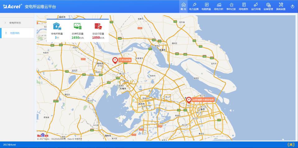 結(jié)合電子地圖顯示變電所的分布情況,并匯總變電所數(shù)量、累計(jì)裝機(jī)容量、累計(jì)運(yùn)行容量等信息,點(diǎn)擊圖標(biāo)可跳轉(zhuǎn)至變電所詳細(xì)信息;