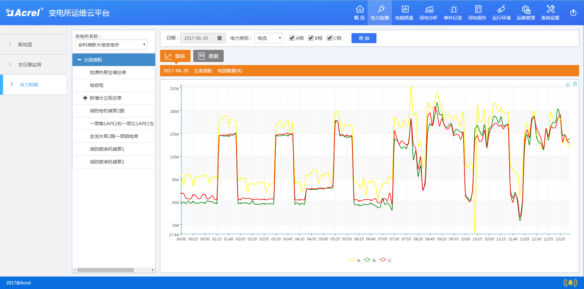 可查詢電力儀表的某天的電力數(shù)據(jù)(電流、電壓、功率、頻率、諧波等),并以圖表和表格的形式顯示,數(shù)據(jù)可導(dǎo)出至EXCEL;