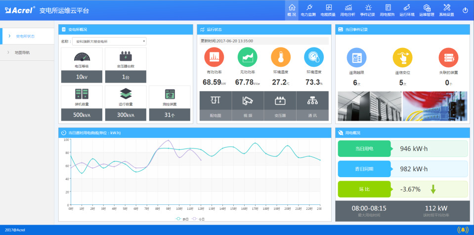 顯示某個(gè)變電所的基本信息(電壓等 、變壓器臺數(shù)、裝機(jī)容量、運(yùn)行容量)、運(yùn)行狀態(tài)(功率、環(huán)境溫濕度等)、事件信息(遙信事件、遙測事件)、當(dāng)日用能情況(逐時(shí)用能趨勢、環(huán)比用能情況);