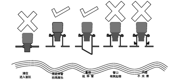 若液位/物位能進(jìn)入儀表的盲區(qū),則需安裝延伸管抬高探頭的安裝高度。延升管的直徑、長(zhǎng)度應(yīng)符合儀表的要求。