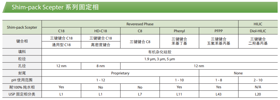Shim-pack Scepter系列是島津開發的有機雜化硅膠填料系列色譜柱,具有高惰性、高穩定性和高柱效等特點,該系列色譜柱可以在較寬pH值流動相范圍內使用,并且具有高的耐受性。本系列有三種填料粒徑可供選擇,1.9μm, 3μm, 5μm,不同的粒徑間具有優良的再現性,可輕松實現HPLC與UHPLC相互間的方法轉換。
