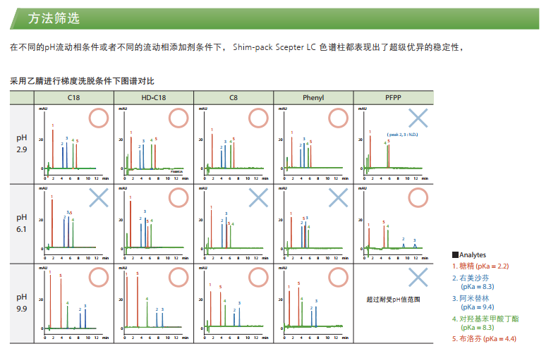 該系列色譜柱可以提供5種不同選擇性的固定相,C18、C8、苯基、五氟苯基和HILIC,能為您提供靈活的方法開發選擇性,從而可以輕松應對各種分離難題。