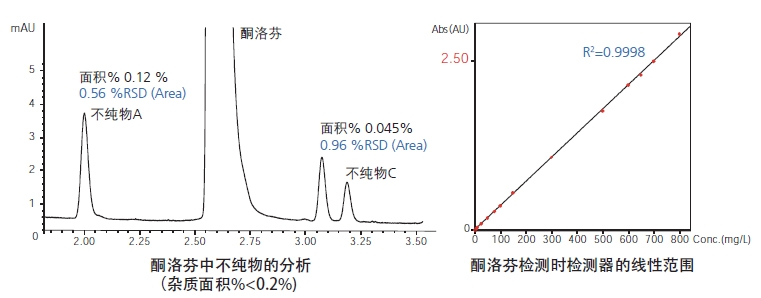 二極管陣列檢測(cè)器SPD-M40具有極高的靈敏度和卓越的線性范圍(2.5 AU)。因此,即使在高濃度的樣品中,也能定量檢測(cè)痕量的雜質(zhì)組分。安裝在檢測(cè)器中的紫外截止濾波器可避免樣品因紫外線而降解,有助于在低濃度下保持良好的線性。
