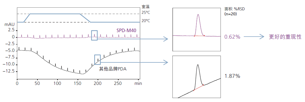 基線波動(dòng)會(huì)影響峰面積的計(jì)算,進(jìn)而降低定量結(jié)果的準(zhǔn)確性。SPD-M40通過“高***光學(xué)系統(tǒng)控溫”功能可分別對(duì)流通池、光源和光學(xué)系統(tǒng)的溫度進(jìn)行控制,以減少外部溫度變化對(duì)系統(tǒng)的影響。與之前的產(chǎn)品相比,噪聲和漂移有了明顯的優(yōu)化。
