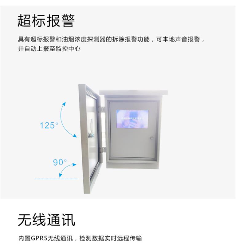 是可實現油煙排放濃度實時監測的儀器,其主要由構成由采集器主體、顯示屏、油煙探頭三部分。內置物聯網3G/4G模塊,采用實時在線、自動上傳的方式工作。采集器帶有油煙探頭專用接口,用于連接探頭。采集器通過控制探頭采集油煙原始數據,讀取探頭采集到的原始數據,并進行計算,*終得到油煙濃度值,可以在顯示屏上直接讀取數據。油煙在線監控系統由實時數據監測、歷史數據查詢、基礎信息管理、用戶信息管理等幾部分功能組成。