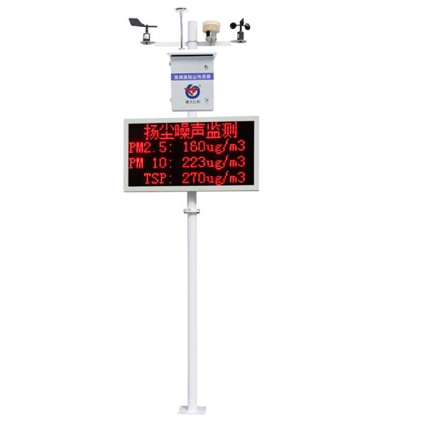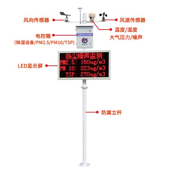 噪聲揚塵監測站是專門針對在建工程項目的監測設備。設備具有泵吸功能采用高精度PM(PM2.5/PM10/TSP)傳感器,并且帶有除濕功能,該設備具有1路百葉盒(溫度、濕度、噪聲、氣壓)采集、1路風速采集、1路風向采集、1路繼電器輸出(默認可接現場二***繼電器控制霧炮)、1路485從站輸出;該設備可通過GPRS方式將數據上傳監控軟件平臺,同時該主機能夠外接1路LED屏(54cm*102cm)實時顯示當前數值信息。