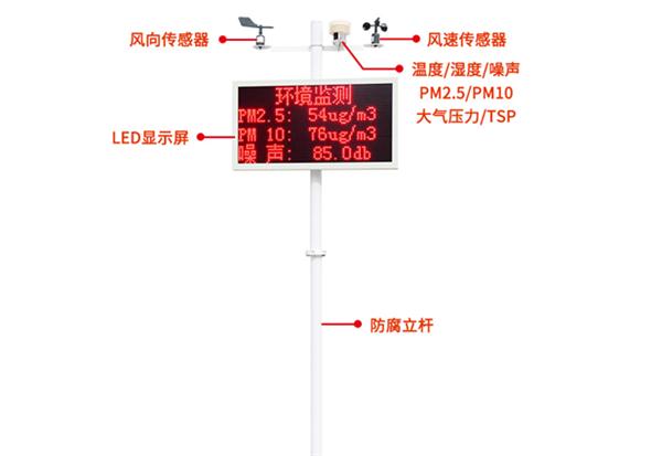噪聲揚塵監測站是專門針對在建工程項目的監測設備。該設備具有1路百葉盒(溫度、濕度、噪聲、PM2.5、PM10、氣壓、TSP)采集、1路風速采集、1路風向采集、1繼電器輸出(默認可接現場二***繼電器控制霧炮)、1路485從站輸出;該設備可通過GPRS方式將數據上傳監控軟件平臺,同時該主機能夠外接1路LED屏(54cm*102cm)實時顯示當前數值信息。