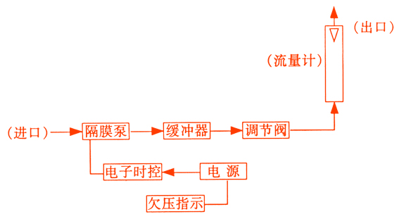 該采樣器整機主要部分由隔膜泵、調節閥、緩沖器、流量計、電子時控電路、欠壓指示電路和電源等部分組成。