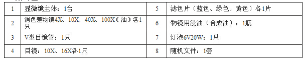 2 | 消色差物鏡4X、10X、40X、100X(油)各1只 | 6 | 物鏡用浸油(合成油):1瓶 |