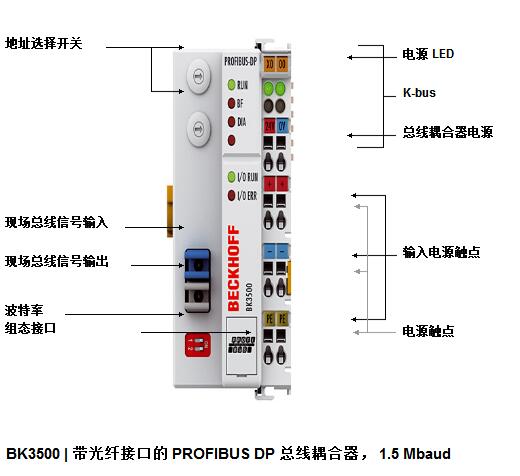 BK3000 總線耦合器用于連接 PROFIBUS 系統與電子端子排,這些端子排可以通過模塊化方式擴展。 個節點由 個總線耦合器、1- 64 個任意數量的端子模塊以及 個末端端子模塊組成。