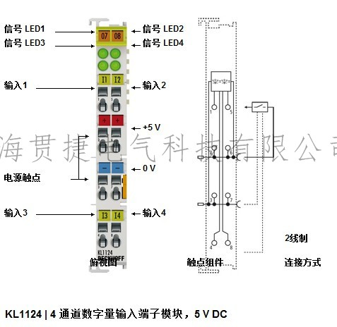 KL1124 數(shù)字量輸入端子模塊從處理層獲得二進(jìn)制控制信號,并以電氣隔離的形式將這些信號傳輸?shù)礁邔拥淖詣踊瘑卧C總€總線端子模塊含有 4 個通道,每個通道都有 個 LED 用來顯示其信號狀態(tài)。通過 KL9505 電機(jī)啟動器端子模塊可以生成 5 V 電源電壓,并饋入至電源觸點中。