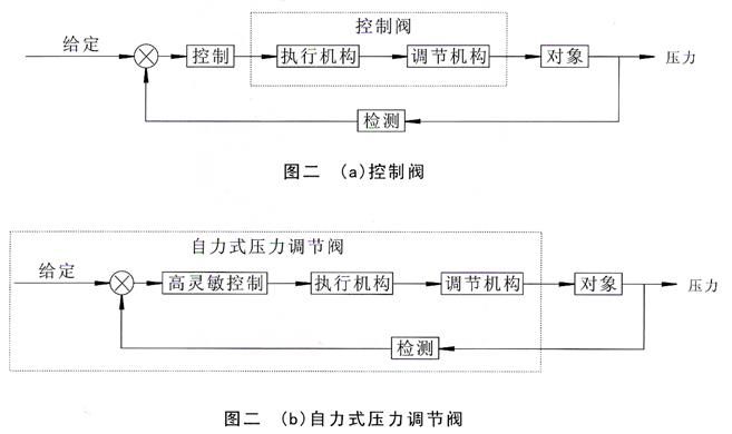 自力式壓力調(diào)節(jié)閥則既不需外來(lái)能源,又不需要接受外來(lái)控制儀表信號(hào),僅靠被調(diào)介質(zhì)的壓力信號(hào),便可實(shí)現(xiàn)壓力調(diào)節(jié)。兩者區(qū)別可見(jiàn)圖二。