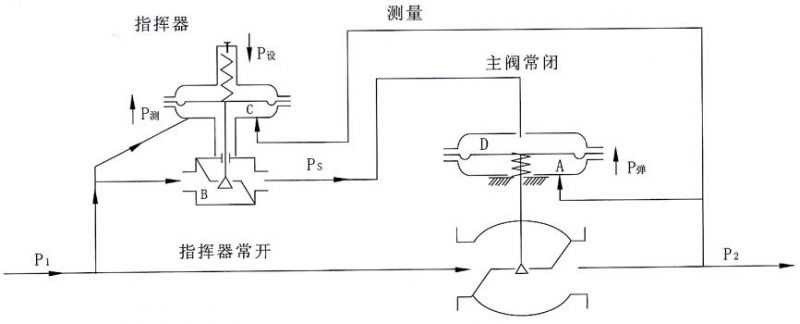 該閥采用 導(dǎo)式結(jié)構(gòu),有兩個(gè)薄膜執(zhí)行機(jī)構(gòu)(指揮器和主閥各 個(gè))閥后壓力 不直接控制主閥芯,而是指揮器執(zhí)行機(jī)構(gòu)控制閥門(mén)主閥的開(kāi)和關(guān),原理如下: